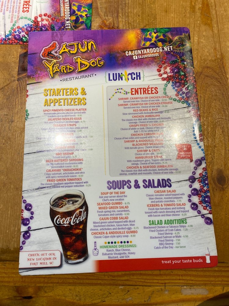 Introducing Cajun Yard Dog, a hidden gem serving up a fusion of New American and Cajun/Creole cuisine in Charlotte, NC. This casual spot offers a variety of lunch options like Fried Shrimp Po'boys and Seafood Gumbo. The menu also features unique starters such as Calamari Ocracoke and Jalapeno Deviled Eggs. Customers rave about the piping hot and flavorful dishes, with favorites like Shrimp and Grits with Fried Okra and Chicken & Andouille Gumbo. The cozy atmosphere with New Orleans/Mardi Gras decorations adds to the charm. Whether you're craving classic Cajun dishes or a contemporary twist, Cajun Yard Dog is a must-visit for a delicious and satisfying meal.